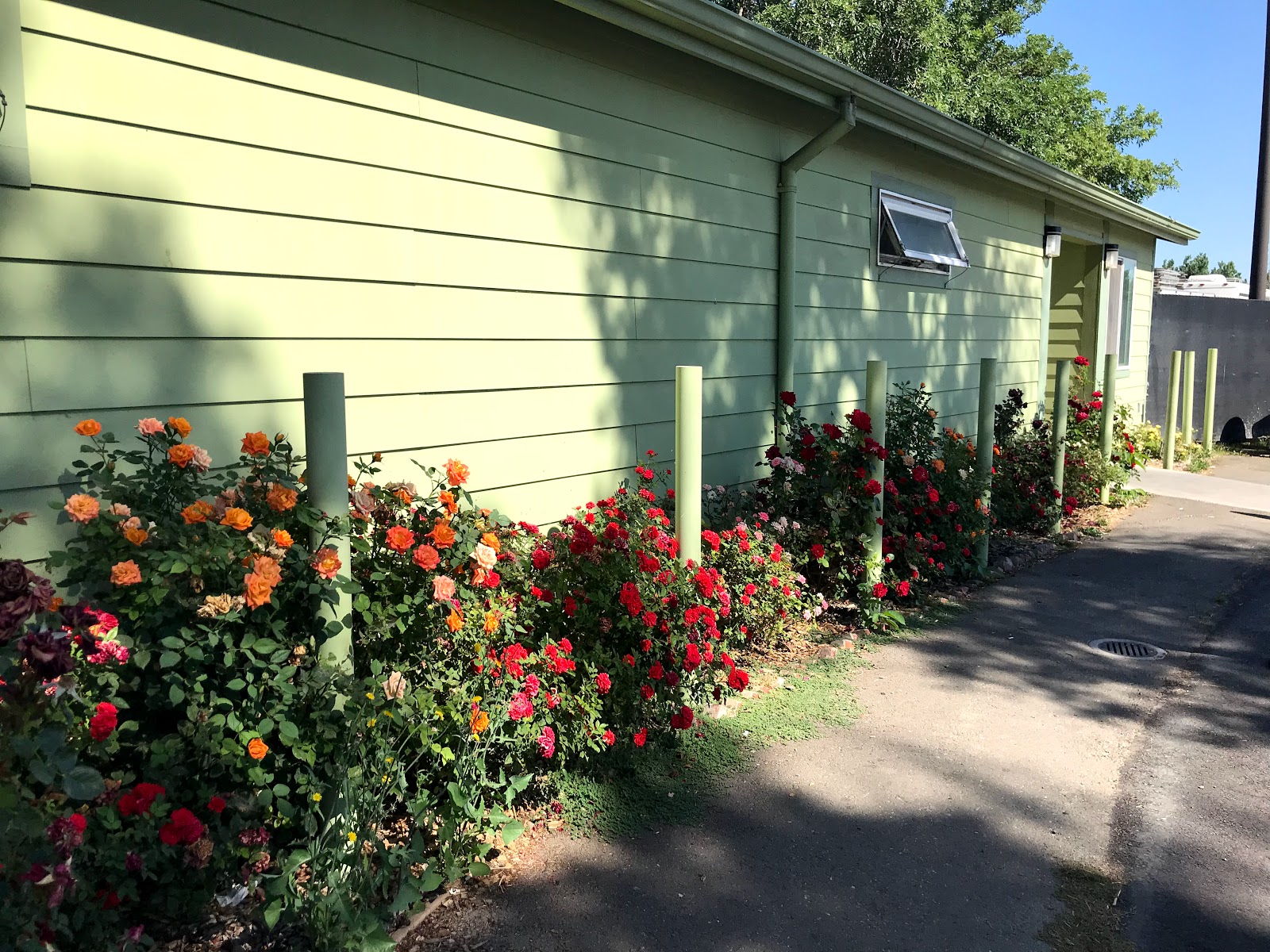 The campground we stayed at was mostly a dirt parking lot but it was the best WiFi we’ve had on this trip. And the roses outside the restroom were a nice surprise.
